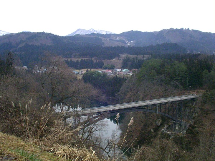 裏手には対岸の国道400号(西方街道)を結ぶ歳時記橋。背後の冠雪は西会津の黒男山(980m)か。