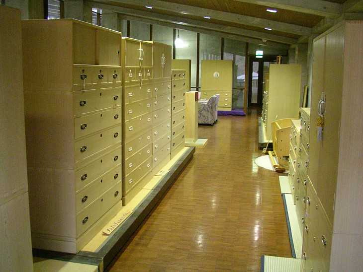 中二階の桐箪笥展示コーナー。娘が生まれたら桐の苗を植え、嫁入りの頃は箪笥が作れる、そんな昔話も。