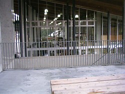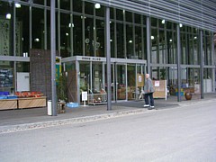 駅舎には狭い情報コーナーがあるだけ。温かい季節なら右奥二階のオープンテラス風スペースに木のテーブルが置いてある。 | |