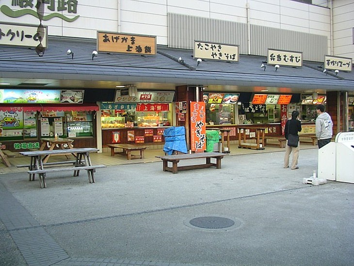 楽座のSA側はテイクアウトの「屋台村・うまいっ処」。扱い品はSAと重複するが客数が多いから採算が取れる。