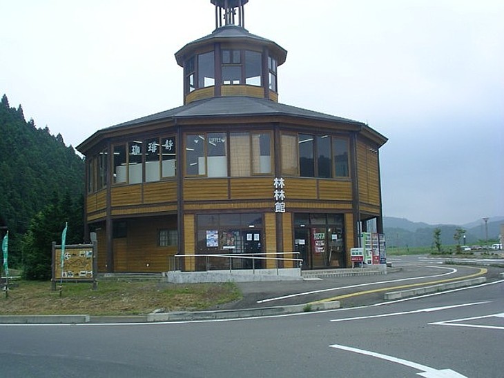 国道沿いの八角形は以前の食事棟。現在の一階は木工品の展示場、二階は喫茶コーナーに利用している。