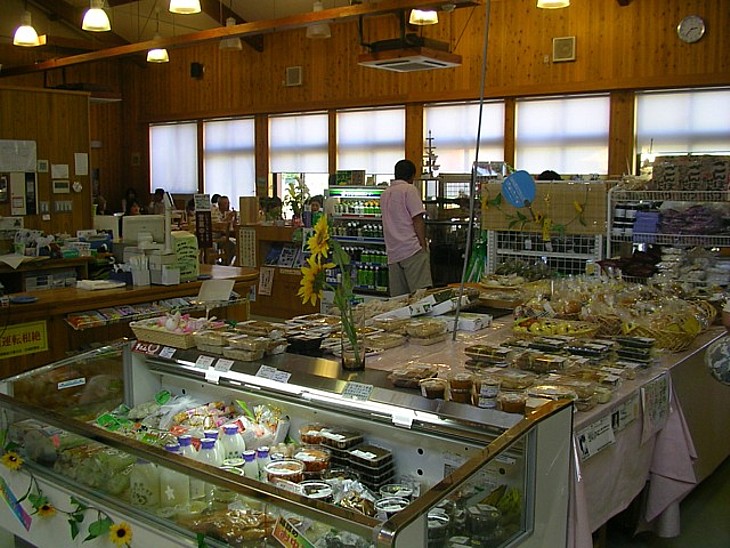 物産コーナーの風景。春の山菜と秋のキノコ、他にも地元で加工した惣菜類が豊富だった。