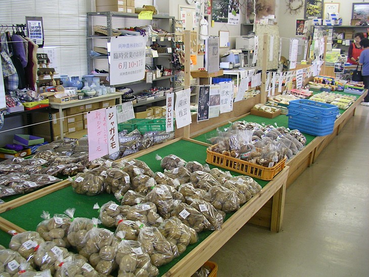 産直野菜や山菜は種類が豊富で価格も実に安い。蕗やこごみ・椎茸などなど、こういう売場って好きなんだよね。