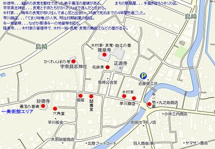 島崎地区には晩年の良寛と貞心尼の痕跡が残る。「はちすば通り」を歩いて良寛の生涯に触れてみよう。