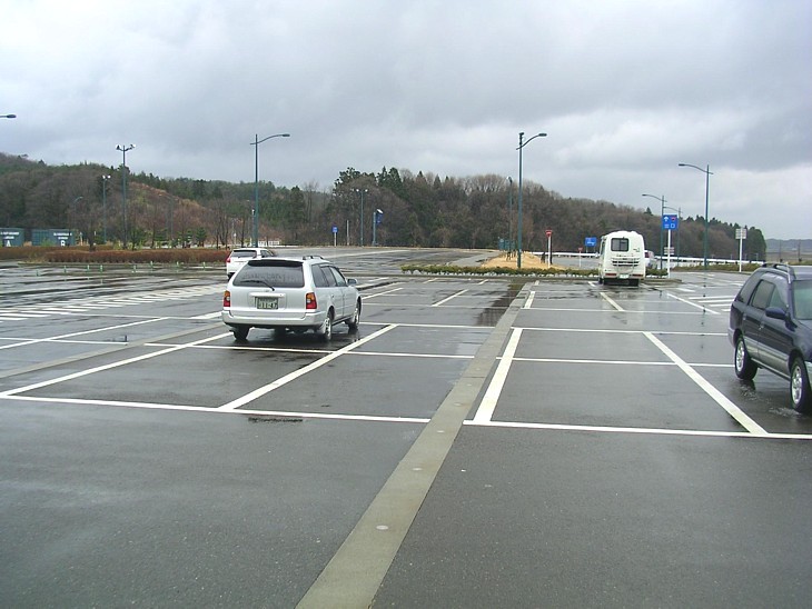 メインの駐車場からバイパスの方向を。進入路の交差点には何故か信号がなく、注意が必要だ。
