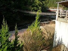 裏を流れる日高川対岸に静かな神社と公園がある。犬が吊り橋を渡るのは無理なので国道を150mほど迂回する必要あり。 |