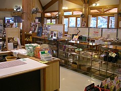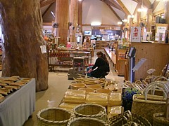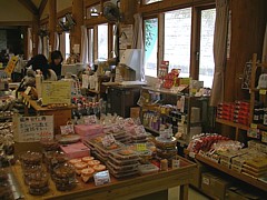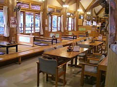 9時〜17時、片側が売店。6人掛けが畳席も含め10卓ほど、かなり広い。太い丸太を多用した店内の雰囲気も観光地っぽい。 |