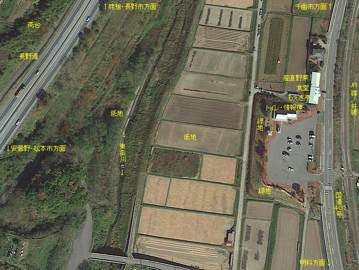 JR篠ノ井線沿いの、野菜直売所がメインの休憩スポット。西側の山裾には高速長野道が走る。