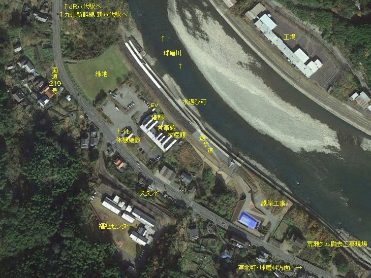 古くて小さな駅だが魅力あり。美しい球磨川と芝生広場、温泉施設も近い。P泊を薦めるには少し物足りないが。