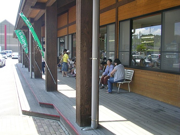 売店のあるメイン駅舎には木床の回廊と3mほどの屋根を設け、ベンチなどが置かれている。