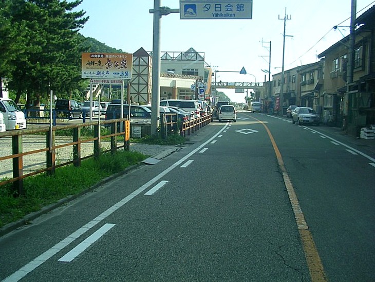 山形県側から駅(夕日会館)に近づく。手前にも駐車場があるがかなり狭くて普通車以上は無理だ。