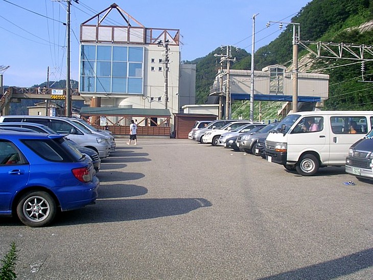 駅舎右側の駐車場。狭いだけではなく奥行きが浅いため6m以上のキャンピングカーは路駐を強いられる。