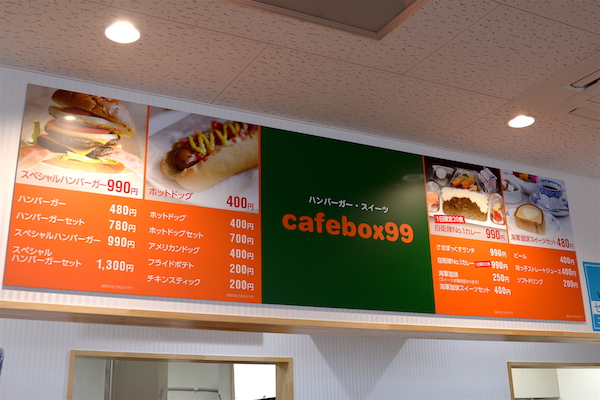 食事処の「ミリタリー食堂」で一通りの軽食を扱っている。駐車場に面してソフトクリームのコンテナあり。 |