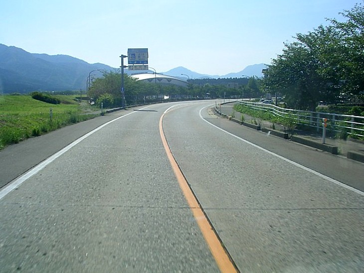 胎内の国道7号からJR米坂線沿いの国道113号を東へ約11km、左側に銀色のドームが見えてくる。
