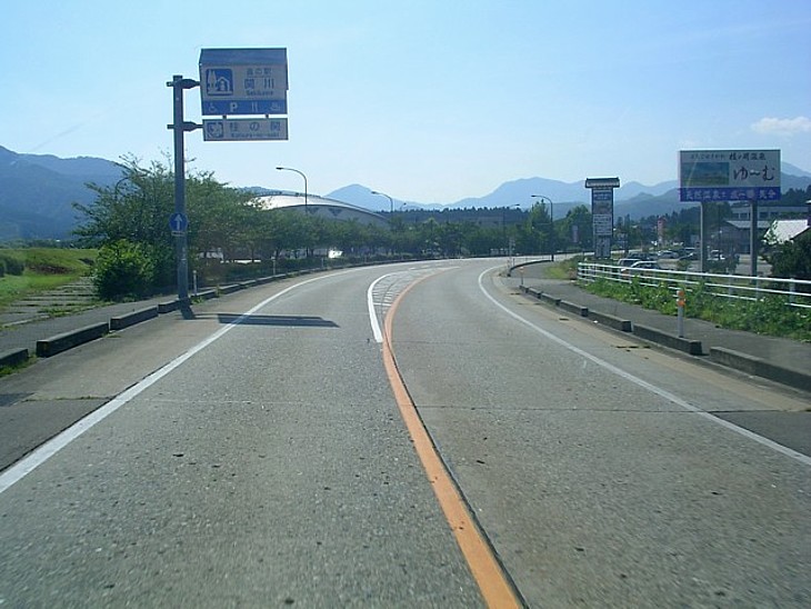 国道は緩くカーブして道の駅に接近。左に「ふれあいどーむ」、右に温泉「ゆ〜む」の看板が見える。