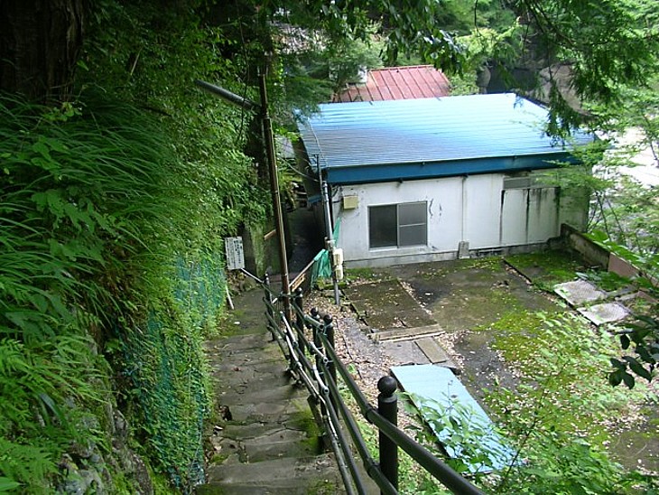 天城湯ヶ島の共同浴場「世古の大湯」に下る道。数台分の駐車場から石段を下った川岸にある。