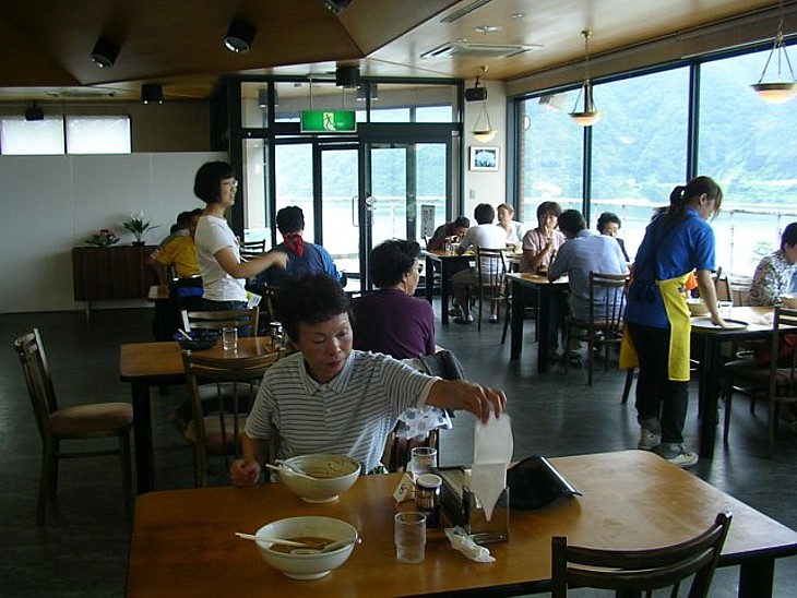 二階の食事処。メニューは平凡だが味は悪くないし、何よりもダム湖を見下ろす展望が素晴らしい。