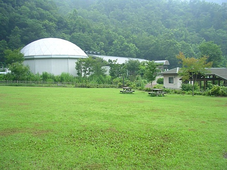 奥の広場にはホタル資料館と並んで古い民家が移築されている。緑が溢れて心が休まるスペースだ。