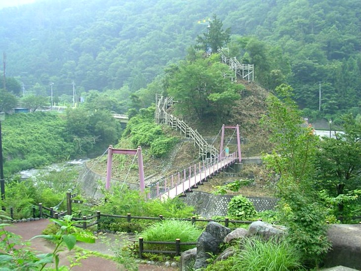 吊り橋から小山の頂上へ遊歩道が続いている。川の左が駅の進入路、山の右手が夜間の駐車場。