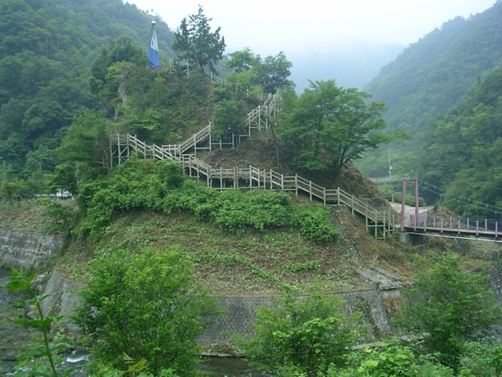 吊り橋と遊歩道の風景。常葉川は山を大きく迂回して右手の国道沿い駐車場横に流れ下っている。