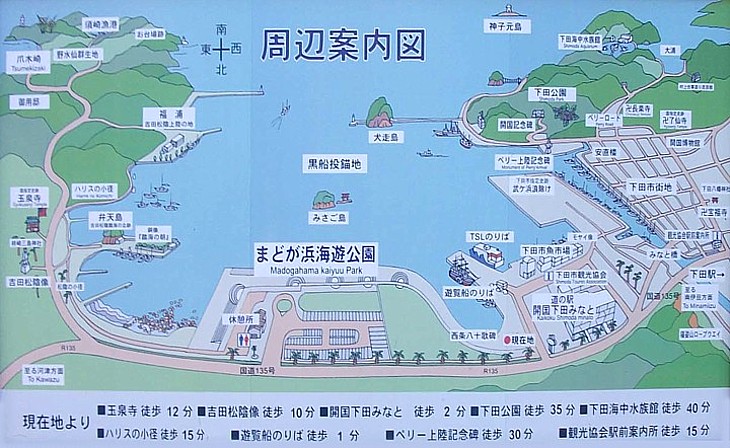 「まどが浜臨海公園」を中心に下田湾周辺の観光地図。殆どのスポットまで徒歩30分以内で行かれる。