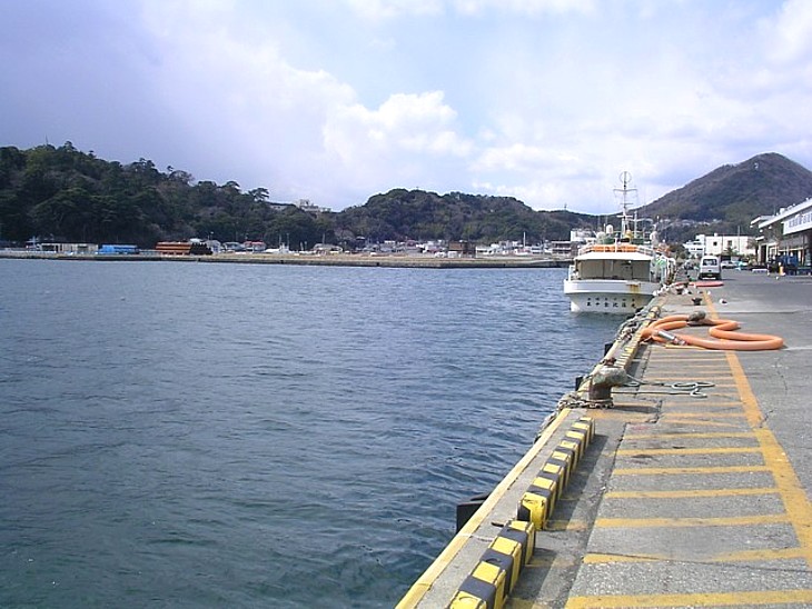 漁港の堤防から市街地方向を撮影。手前に埋立地、埋立地と背後の高台の間に稲生沢川が流れ込む。