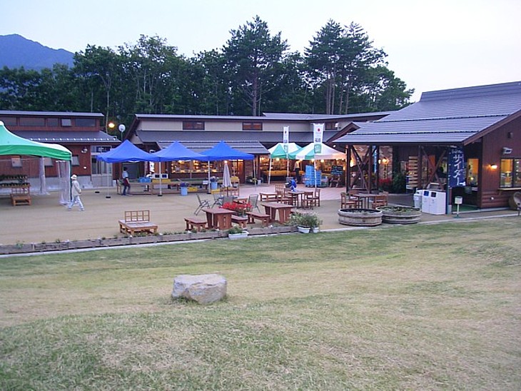 芝生広場に造られた低い丘から駅舎を眺める。今回は「大内宿」などを経由したため到着が夕刻になった。