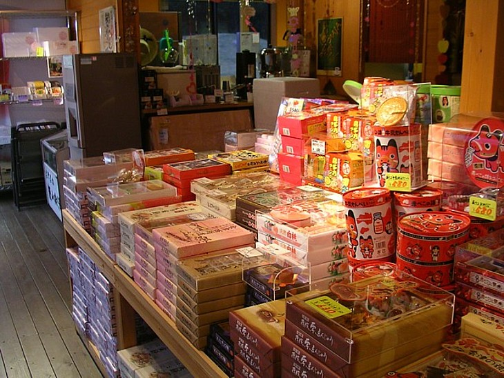 駅舎内の売店には目を惹く品は見当たらない。山菜やキノコなど山里の産物は外の特設台の方が面白い。