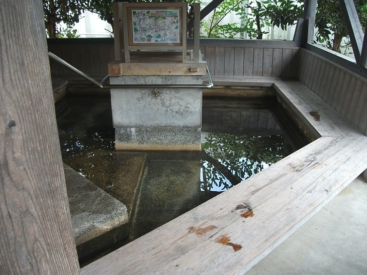 掃除が不足していた無料足湯は10〜17時に利用できる。下賀茂は伊豆で最も高温の源泉で知られている。