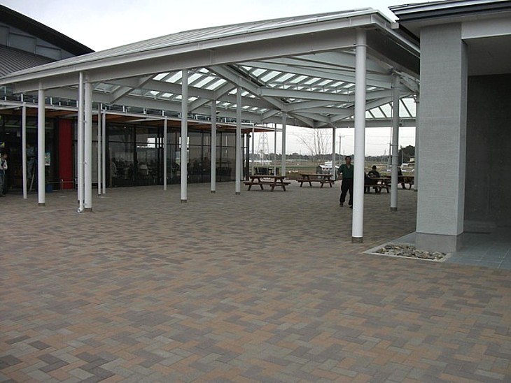 左側の駅舎と右側の休憩室棟の間は屋外の休憩コーナー、数台のガーデンテーブルが置いてある。