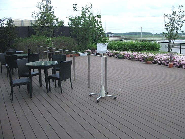 屋外のウッドデッキにも客席を設けてある。すぐ横は花壇と芝生ガーデン、右側は屋外休憩所に続く。