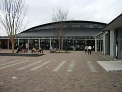 左: 物見塔前からメイン駅舎を。左側の樹木横は今は「B級グルメ」コーナーになっているが撮影した2011年OPEN直後は広々としている。