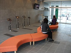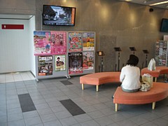 広い情報&休憩コーナーを備えている。トイレに併設しているのが少し気になるがソファなども充分に備えている。