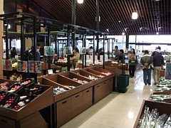 上: 産直野菜や食品売場は高級感を前面に出した雰囲気で、都内の「成城石井」や静岡の「あおき」みたいに照明を下げて訴求している。