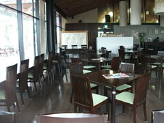 中: 照明が少し暗め、落ち着いた内装と什器で雰囲気を統一している。道の駅の食堂らしくないとも、高級感を出す試みとも受け取れる部分で、