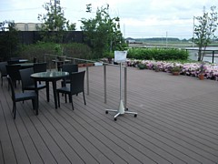 右: 屋外のウッドデッキにも雰囲気の良い客席を設けてある。すぐ横には花壇と芝生ガーデン、右側は自販機のある屋外休憩所に続く。