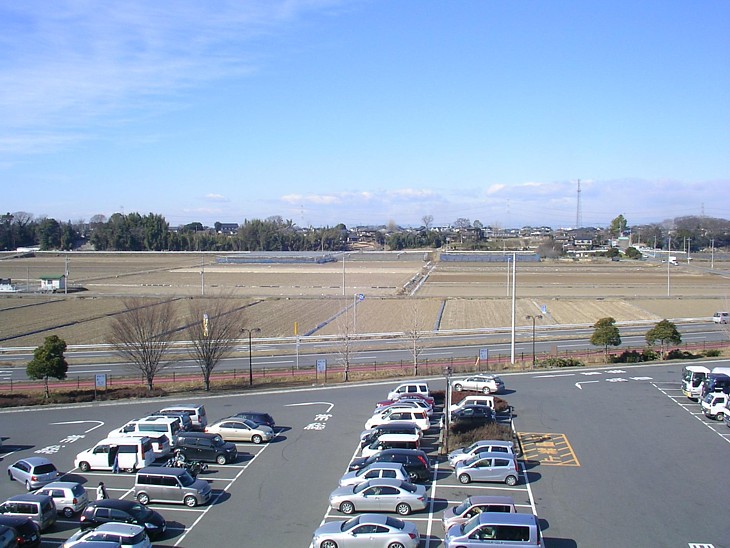 西側は羽生・加須など埼玉県の方向。1kmほど西側にはローカルな関東鉄道常総線が通っている。