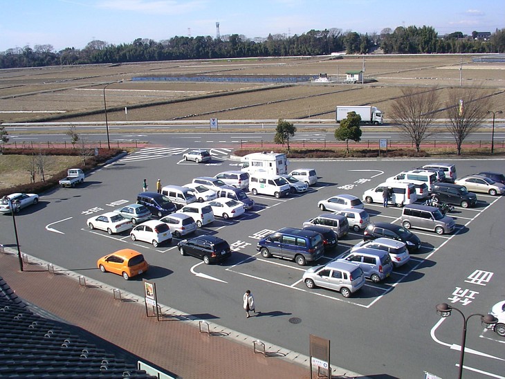 駐車場の左側、普通車用のスペース。南(常総・取手方面)に向う車はこの出口を利用して国道へ。