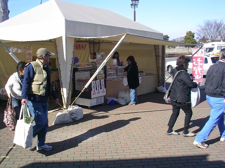 蕎麦処前のテント販売。手作りおにぎりとパン・鉾田市産のキムチ、あんまんなど渾然としている。