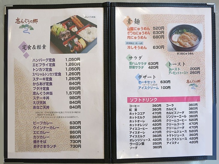 「志んぐうの郷」は11〜21時・火曜と年末年始休み、献立はメニュー表で。 |