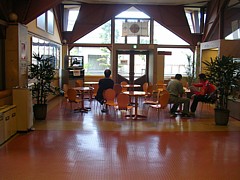 8時〜21時、情報提供を兼ねた広いスペースにベンチが多数、テーブル類は置いていないので飲食には利用しにくいがスペースは充分だ。展示コーナーには5mの大型水槽の名産の白エビ飼育水槽が設置してあり、家族連れにも楽しめる。 | |