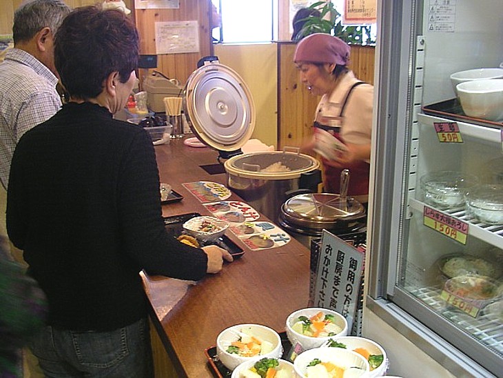 食事処はカフェテリア方式。先に惣菜を選び、最後に御飯と汁物を受け取るシステム(現在は変更されている)。