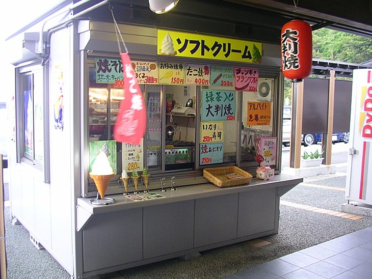 自販機の横にある軽食コーナー。ソフト・焼きそば・たこ焼き・焼きお握りや稲荷寿司などの屋台がある。