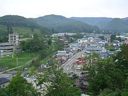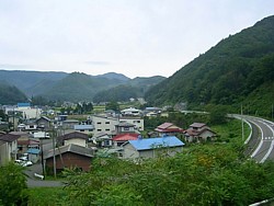 駅舎の裏を流れる川井川を渡ると消防署の前を通って見晴台のある丹内神社へ続く長い石段前に出る。今回はここから登って左手の細道から戻るルートを歩いてみた。西へ延びる国道の先には内陸部の山並みが続き、なかなか快適な散歩だった。 | |