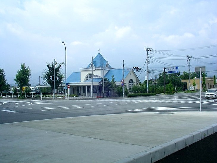 中部横断道の高架下から。右側にはJAの直売所、道路を直進すると南アルプス市の中心街だ。