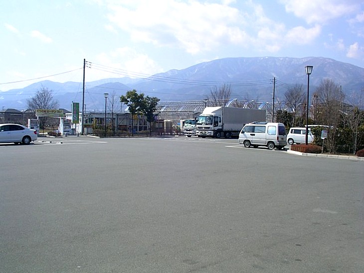 一番奥が大型車の駐車場、遠くに南アルプスが見える。季節になると隣地の果樹園も直売所を開く。