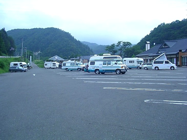 雫石市街と田沢湖を結ぶ国道46号から一段下がった駐車場。背後の山裾にキャンプ場がある。