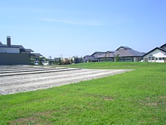 空いていれば敷地の芝生で走らせるのも可。周辺にも散歩向きの道が伸びている。県道を渡り赤川沿いに歩くのも面白い。
