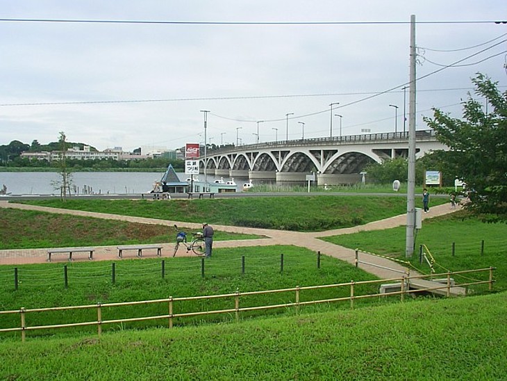駅裏の緑地から手賀大橋を撮影。すぐ前にボード乗り場、橋の右方向・4km先には「手賀の丘公園」がある。