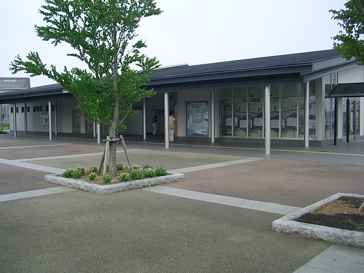 アプローチ部分の右隅にはトイレと休憩コーナーと情報館、石畳を挟んで左隅の「食彩館」と向き合っている。